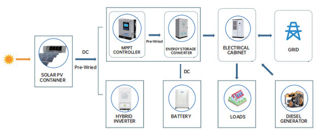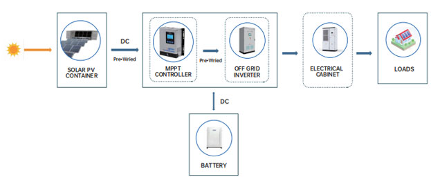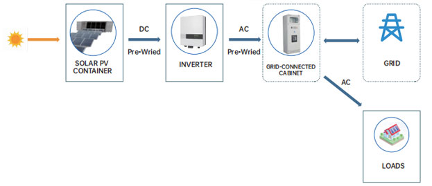جریان مستقیم تولید شده توسط ماژول خورشیدی توسط اینورتر به جریان متناوب تبدیل می شود که سپس به بار عرضه می شود و به شبکه متصل می شود. به این ترتیب، همزمان با تامین بار خانگی، برق اضافی نیز می تواند به شبکه فروخته شود.